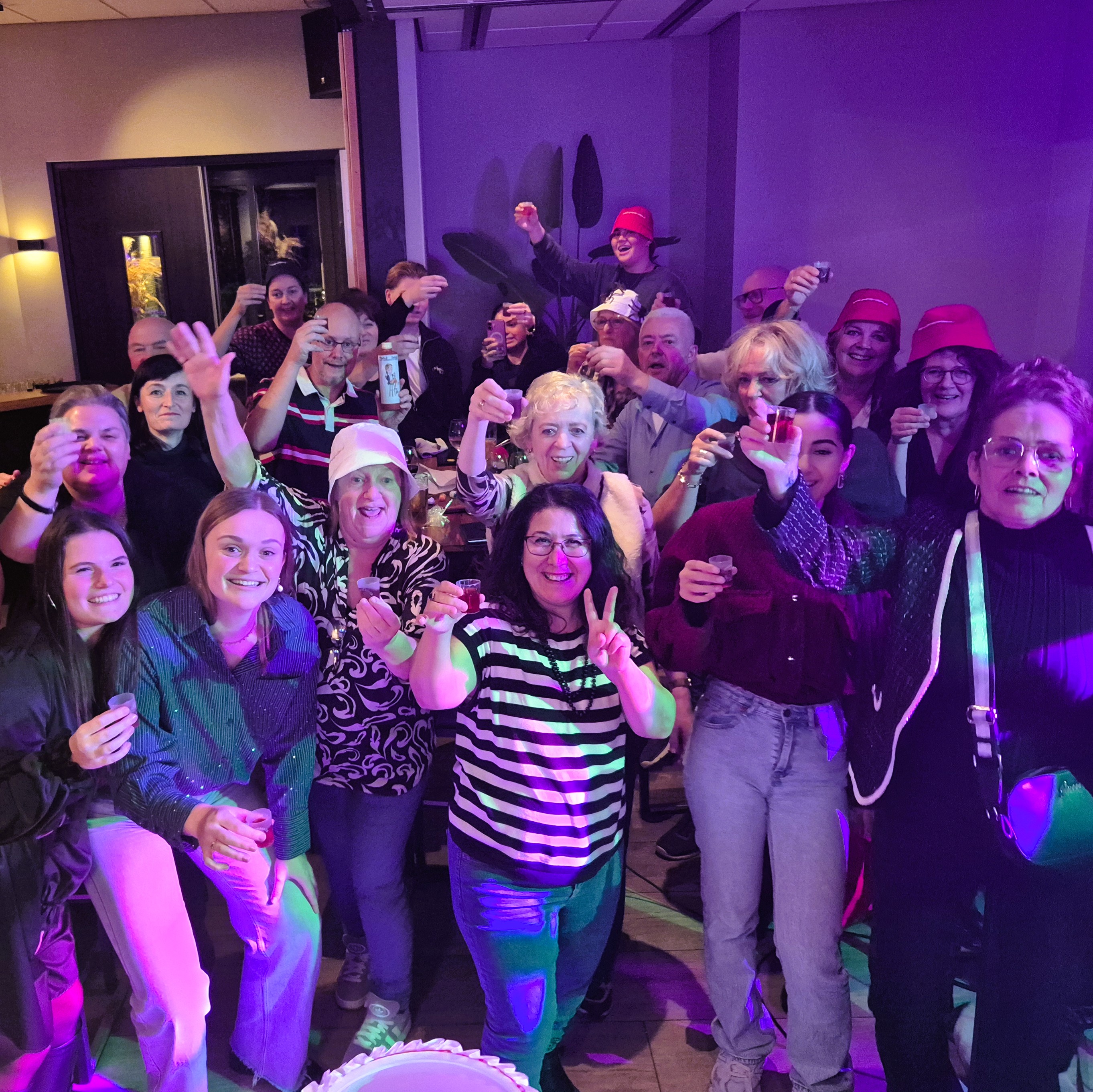 De rode loper lag klaar voor de collega’s van Brabantzorg. Bij binnenkomst werden collega’s gastvrij ontvangen met een drankje, terwijl het team van Pop-up Groep achter de schermen alles tot in de puntjes had voorbereid voor de start van de spelshow. De collega’s werden verdeeld in drie teams en al snel zat de energie erin. Met leuke opdrachten, het raden van Brabantse liedjes en vragen over Brabantzorg ontstond er een interactieve spelshow vol herkenning, fanatisme en vooral veel gelach. Omdat het Halloween was, gaven we ook daar een speelse draai aan. Gezelligheid en humor stonden, zoals altijd hoog in het vaandel. Onder het genot van een hapje en een drankje, verzorgd door onze fijne horecapartner Clemens, werd het een avond die nog lang werd nabesproken. Een geslaagde avond waarin collega’s samen lol hebben, lachten en herinneringen maakten. Precies zoals bedoeld. Een geslaagd bedrijfsuitje op locatie in Oss.